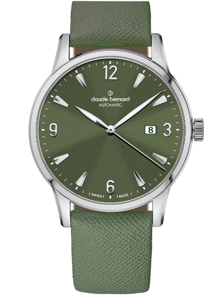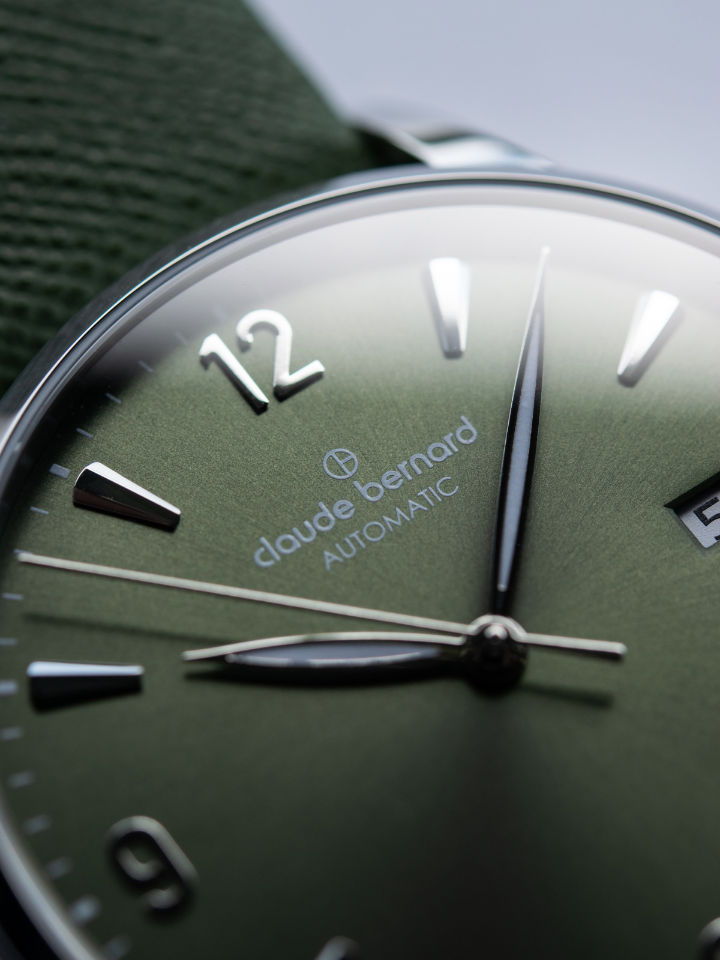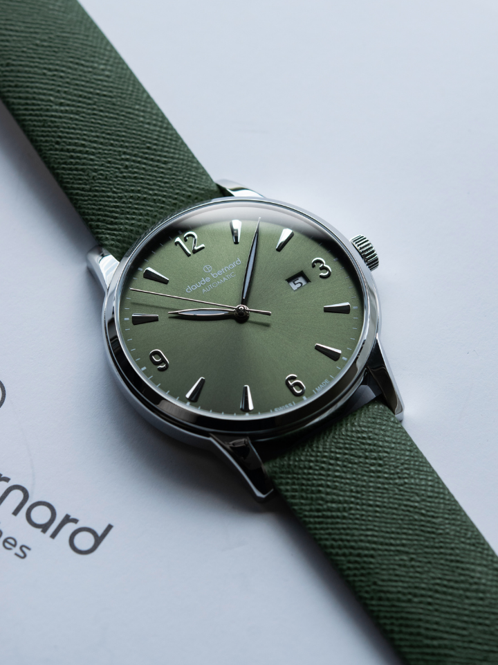 The Classic Automatic Date by Claude Bernard features a transparent caseback that offers an incredible view on teh mechanical heartbeat of its Swiss-made automatic movement.