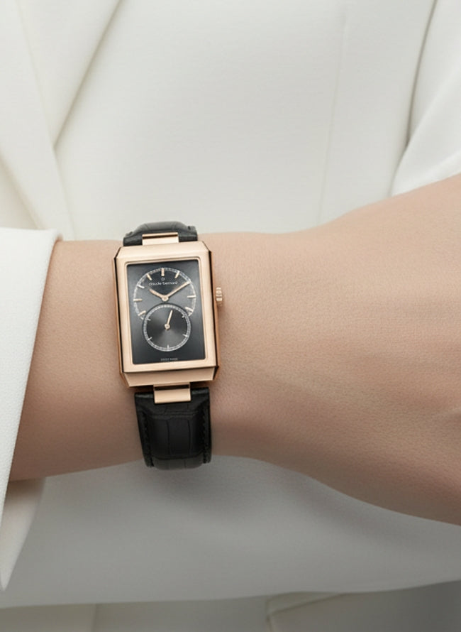 The Claude Bernard Ora Vera features a refined rectangular case and a small seconds subdial inspired by classic watchmaking. Its slim profile and clean design make it an ideal dress watch for formal occasions and everyday elegance.